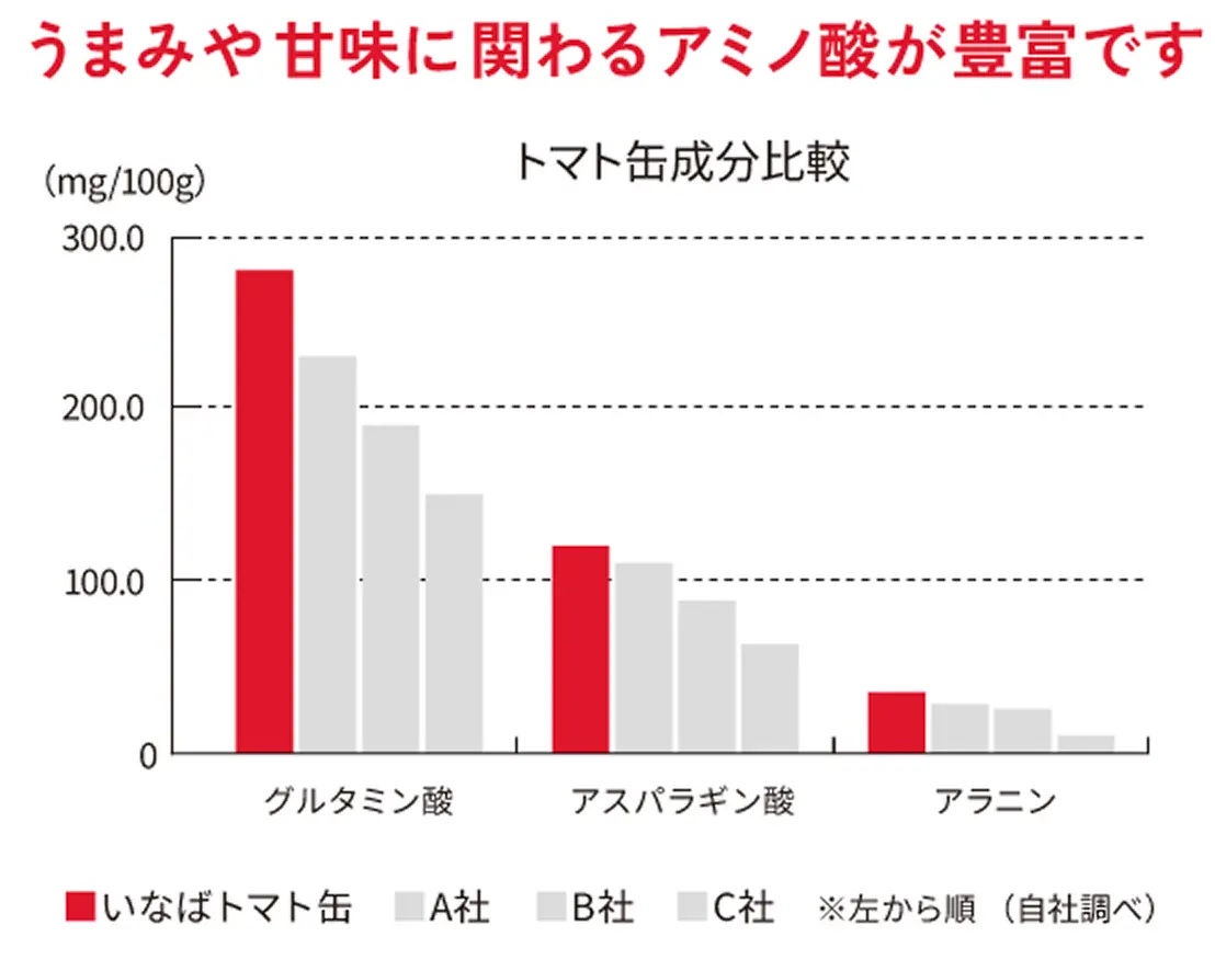 旨み成分である「グルタミン酸」の含有量は、自社調べにおいて他社を圧倒する数値を計測しました 。